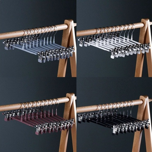 바지걸이(Pants Hanger): 바지걸이는 주로 바지나 슬랙스와 같은 하의를 보관하는 데 사용됩니다. 일반적으로는 여러 개의 클립 또는 팬츠를 걸 수 있는 가로 막대로 구성되어 있습니다. 이를 통해 바지를 편리하게 보관하고 주름이 생기지 않도록 돕습니다.